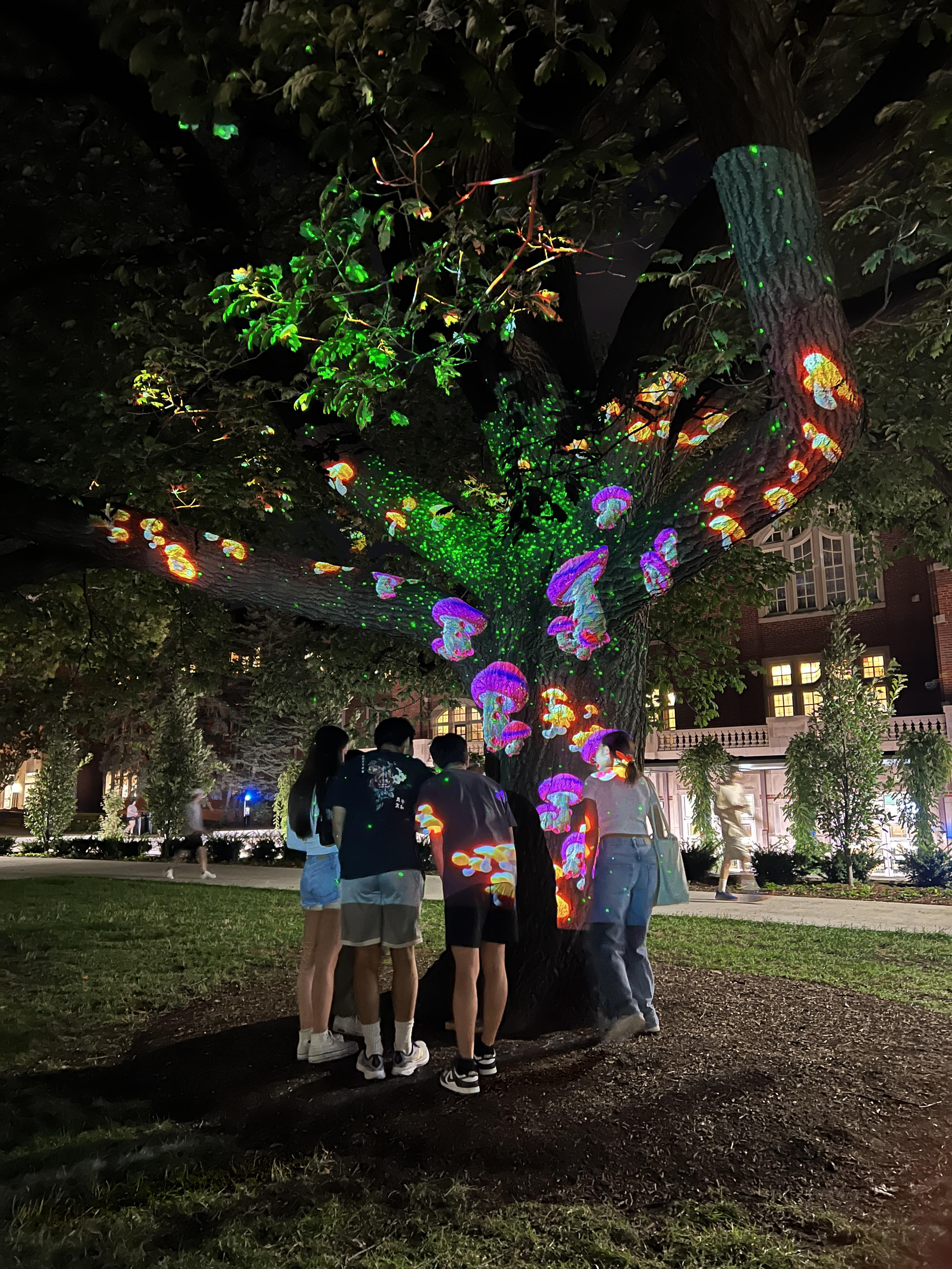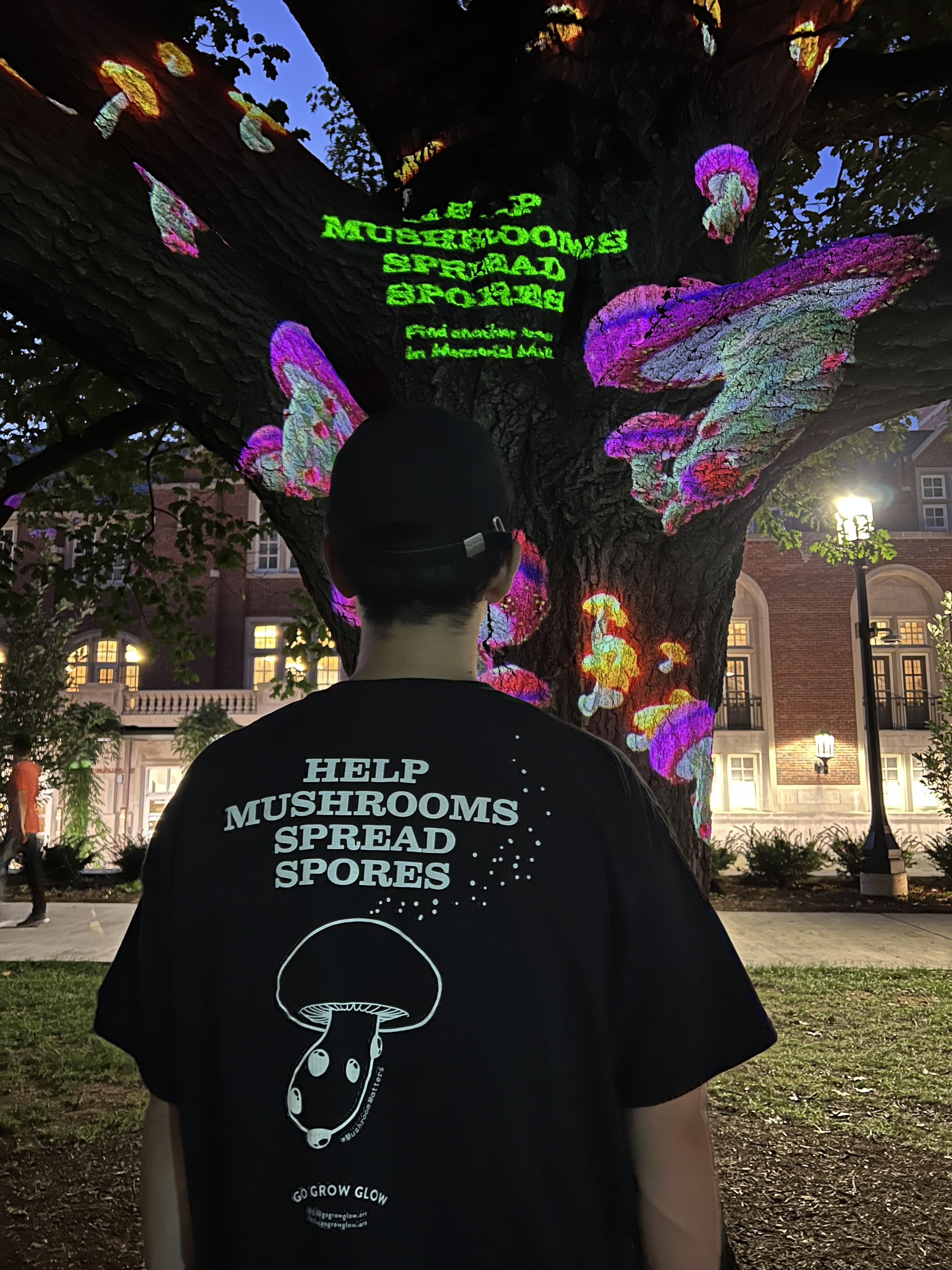 At each location, viewers will come across a tree that needs assistance in spreading "spores." The animations of the mushrooms will change based on the distance between the viewers and the tree. When no one is near the tree, floating mushroom spores appear, capturing people's interest and curiosity. As viewers approach the tree, the mushrooms grow gradually in response to their increasing interest. When viewers' curiosity about mushrooms peaks, the tree releases spores. Those who receive spores from a tree are then motivated to find a different tree to disperse spores, playing the role of an insect to aid in the reproduction of mushrooms