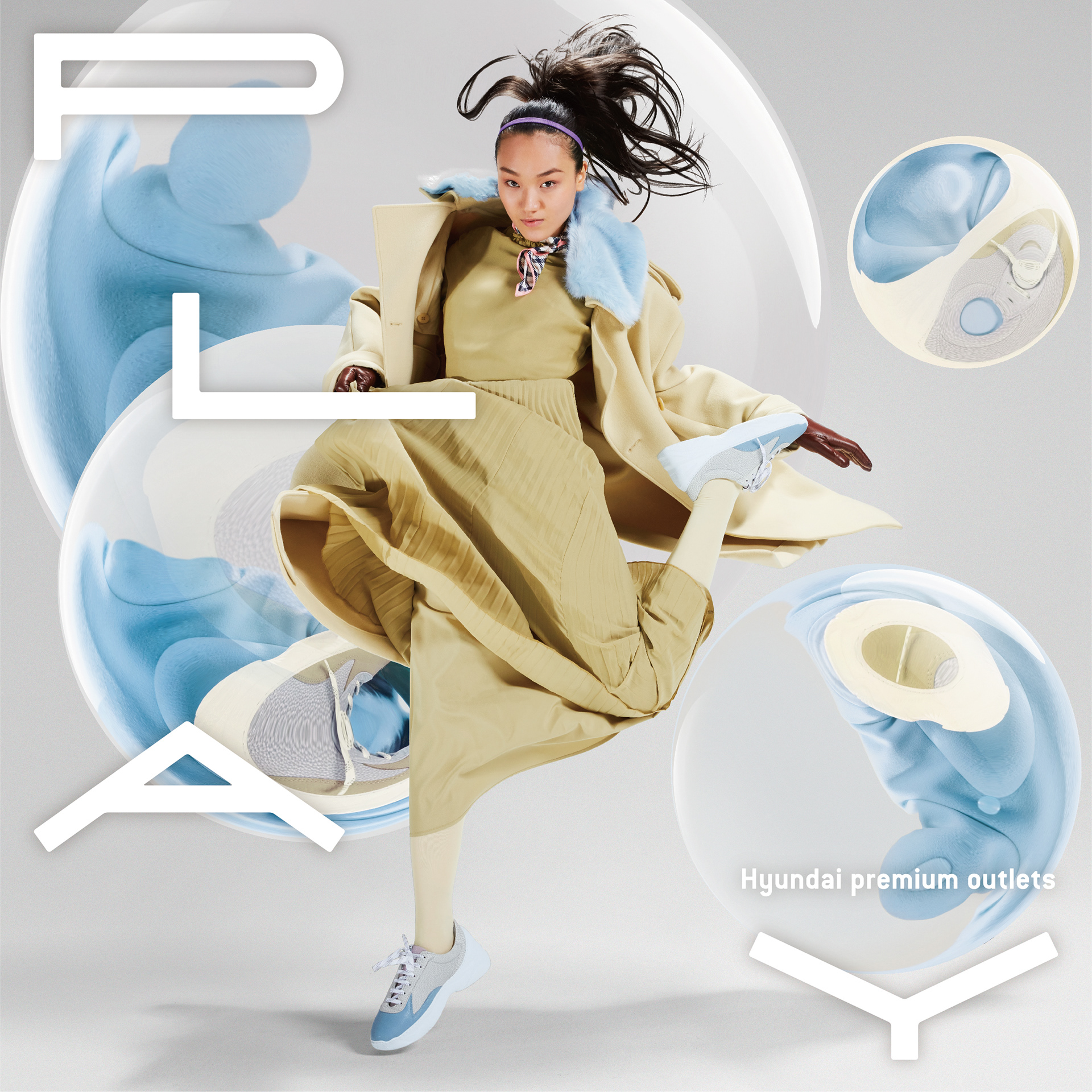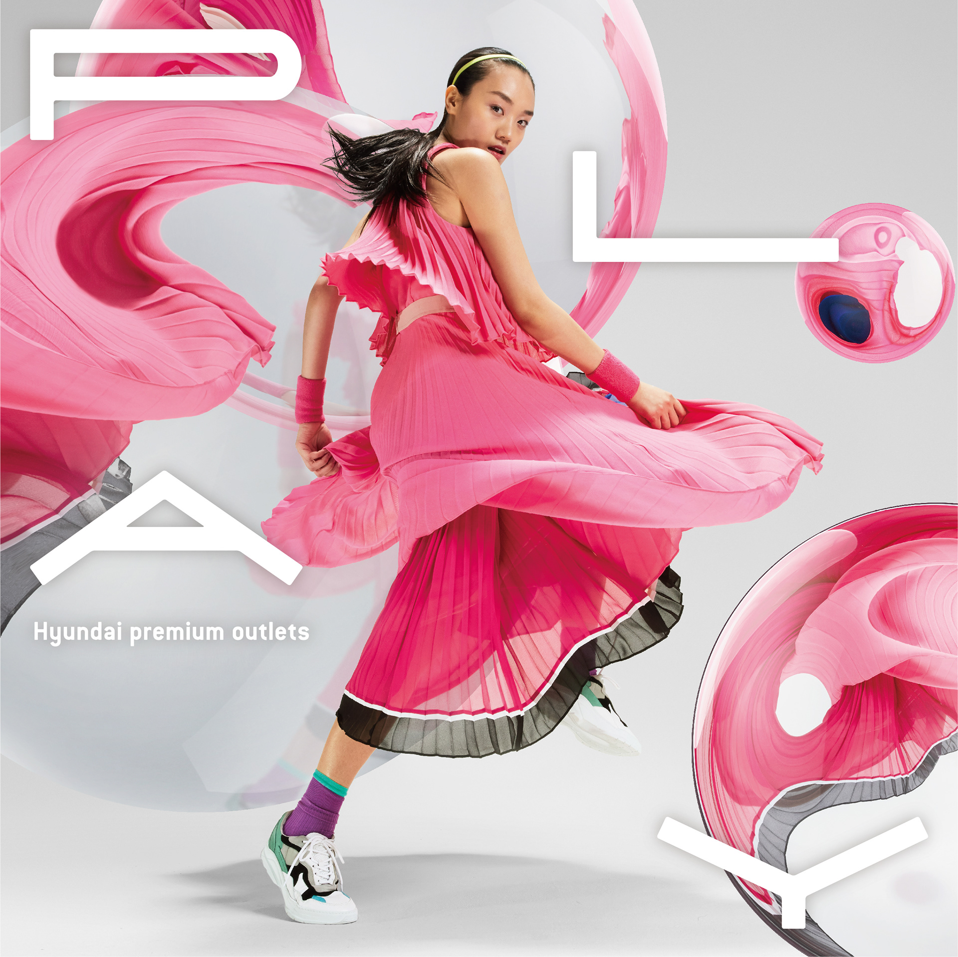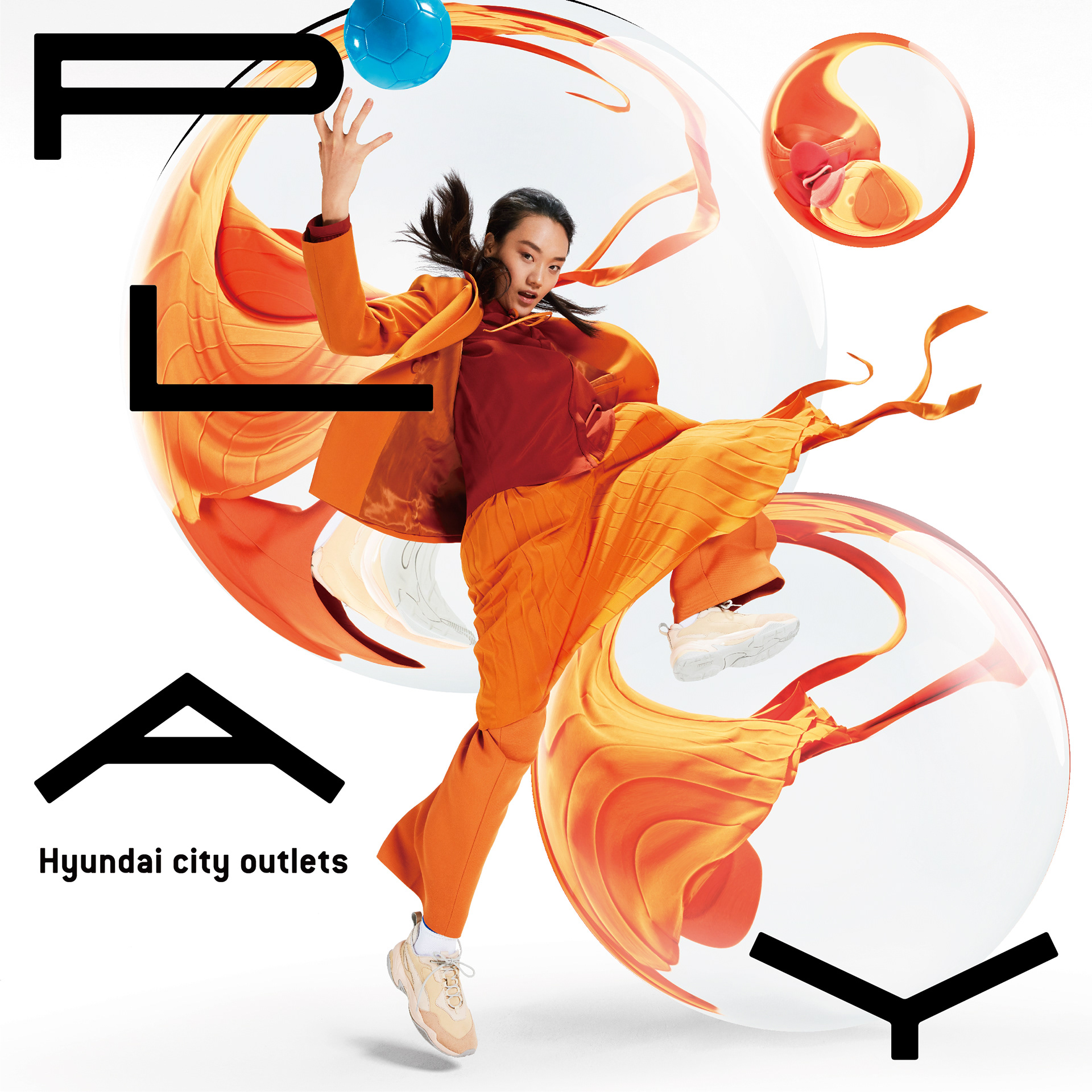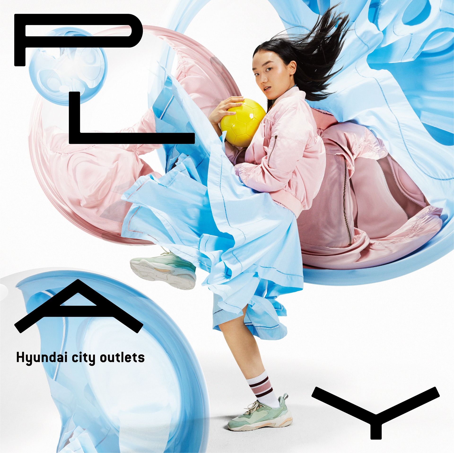 To visualize Hyundai Outlets’ slogan, Everyday Playing Place, this project highlights dynamic female poses—such as jumping and preparing to throw a ball—to convey movement and active play. While maintaining a trendy, fashion-forward aesthetic, the design emphasizes energy and motion in the female figure.